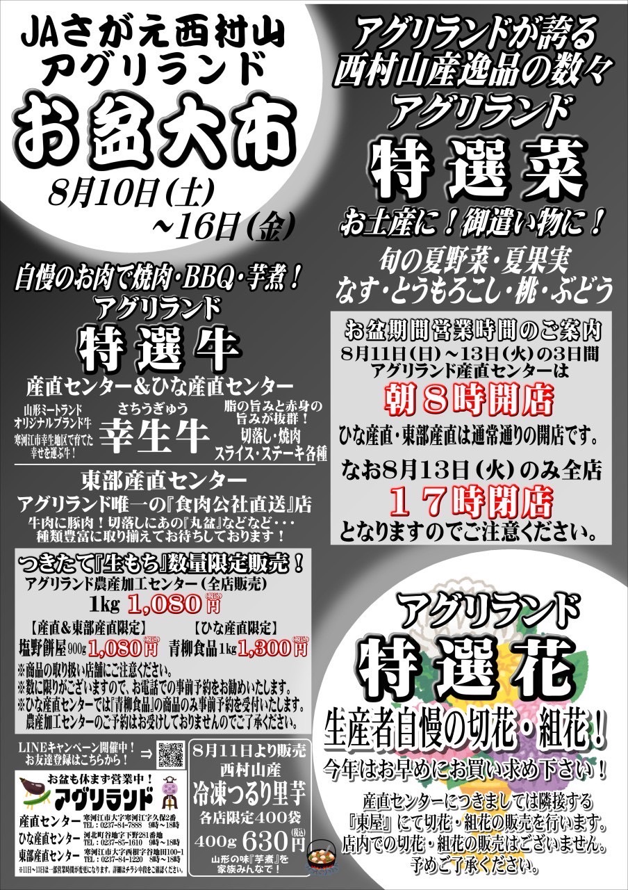 JAさがえ西村山アグリランド様「お盆大市」開催 2024.08.10 取り扱い店舗のお知らせ 2024年8月10日(土)から16日(金)まで、JAさがえ西村山アグリランド様にてお盆大市が開催されます。 弊社ブランド牛『幸生牛』も販売しております。この機会に是非ご賞味ください!